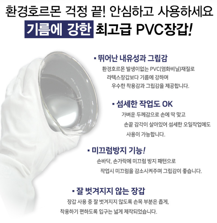 뛰어난 내유성과 그립감 - 환경호르몬 발생이 없는 PVC(염화비닐)재질로 라텍스장갑보다 기름에 강하며 우수한 착용감과 그립감을 제공합니다.