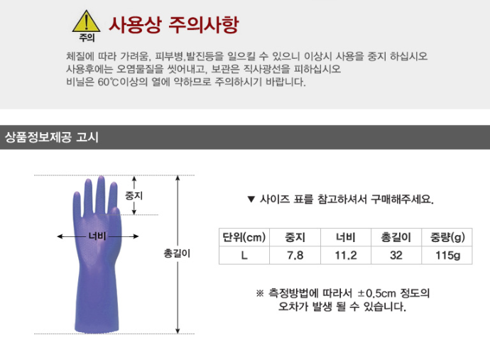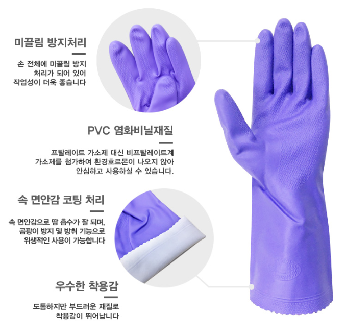 품명 ■ 세탁 세제 및 산, 알칼리성 약품에 대한 우수한 내구성 ■ 부드럽고 도톰한 두께의 PVC 장갑