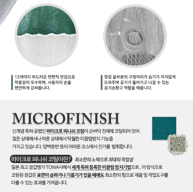 ■13게이지 부드러운 면편직 안감으로 착용감이 우수하며, 사용자의 손을 편안하게 감싸줍니다.