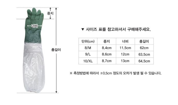 ■어깨까지 오는 길이 - 장갑의 길이가 62~64.5cm로 따로 방수토시나 방수작업복을 착용하지 않아도 충분한 보호력을 가집니다.