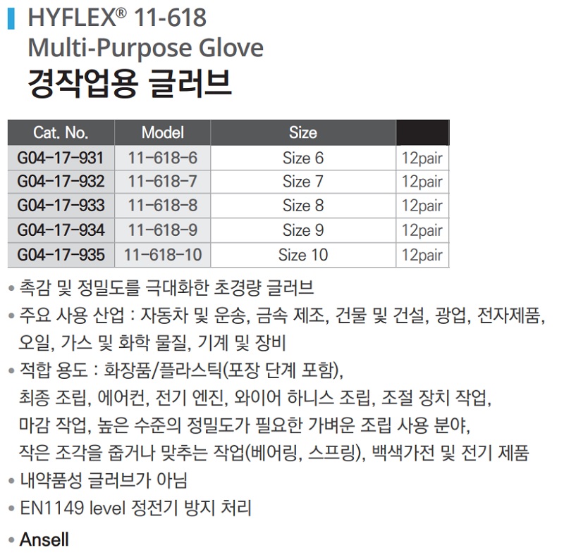 품명 ■ 촉감 및 정밀도를 극대화한 초경량 글러브 ■ 주요 사용 산업 : 자동차 및 운송, 금속 제조, 건물 및 건설, 광업, 전자제품, 오일,가스 및 화학물질, 기계 및 장비 ■ 적합 용도 : 화장품/플라스틱(포장 단계 포함), 최종 조립, 에어컨, 전기 엔진, 와이어 하니스 조립, 조절 장치 작업, 마감 작업, 높은 수준의 정밀도가 필요한 가벼운 조립 사용 분야, 작은 조각을 줍거나 맞추는 작업(베어링, 스프링), 백색가전 및 전기 제품 ■ 내약품성 장갑