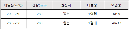 품명 ■ 내열성 우레탄(내열 온도 260℃)을 양면에 사용하고, 아라미드 섬유(aramid fiber)로 직조함 ■ AP-17은 안쪽에 폴리에스테르 펠트를 채용하고 있음