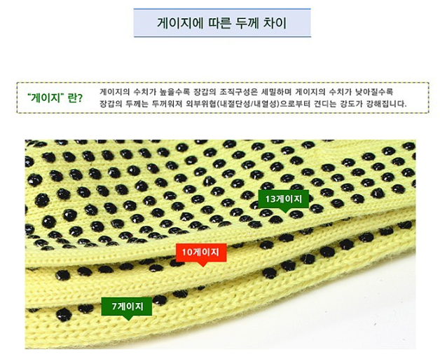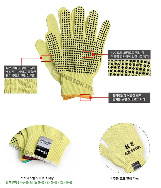 품명 ■ 내열성 듀폰 케블라(Dupont Kevlar) 섬유(분해온도: 427℃~482℃) 편직 장갑 ■ 손바닥 PVC 단면도트 코팅으로 미끌림 방지