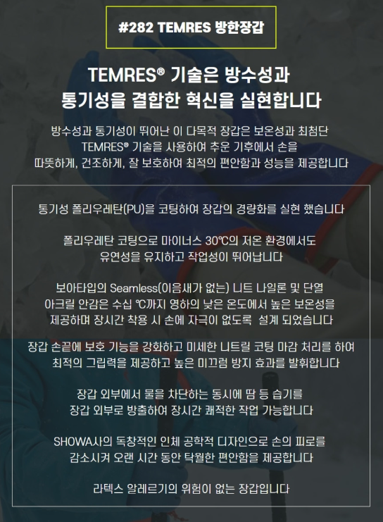 쇼와 282 PU 코팅 방수 겨울 작업용 방한 장갑 쇼와 냉동창고 기모 이중코팅 / 1켤레