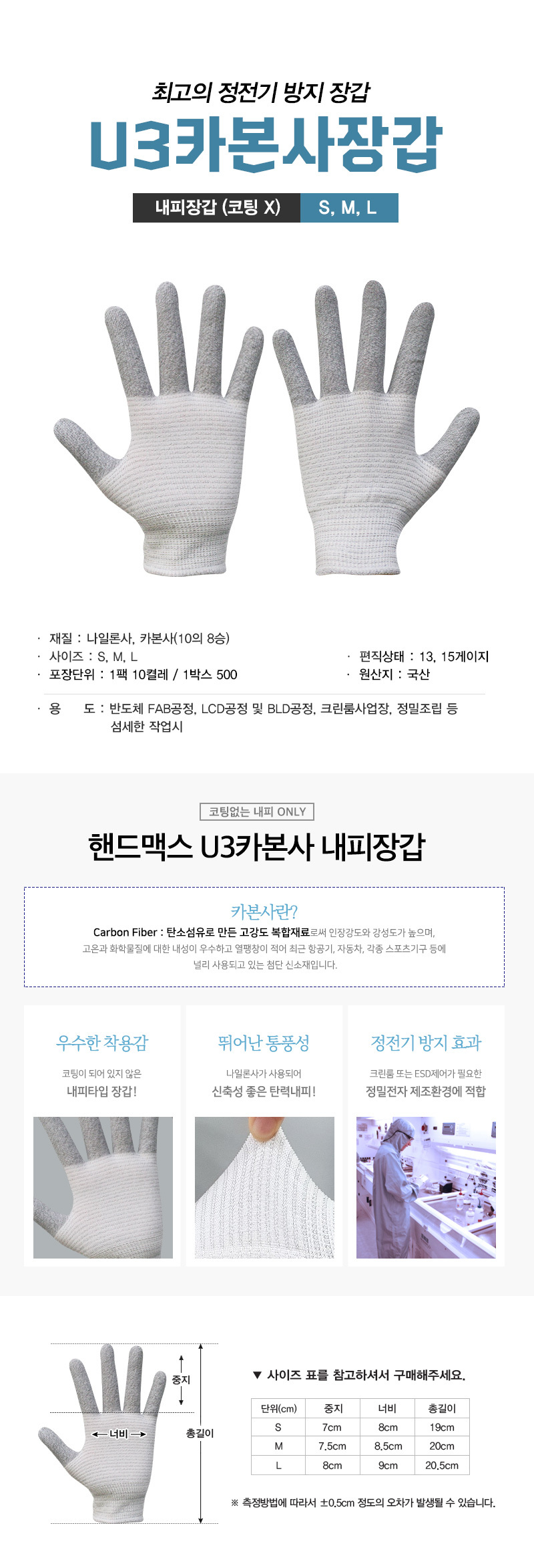 정전기방지장갑 U3카본사내피 100켤레 내피타입장갑