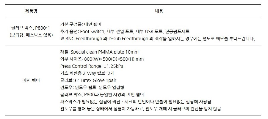 품명 패스박스 없는 단일 챔버형 글로브 박스 P800-1, 연구실 무균 작업 및 가스치환 실험에 적합한 보급형 장비.