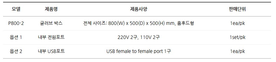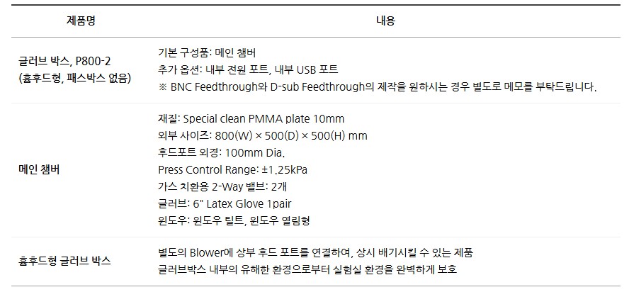 글러브 박스 P800-2는 흄후드형(패스박스 없음) 모델로, 메인 챔버와 옵션 포트 구성이 가능한 실험 장비입니다.