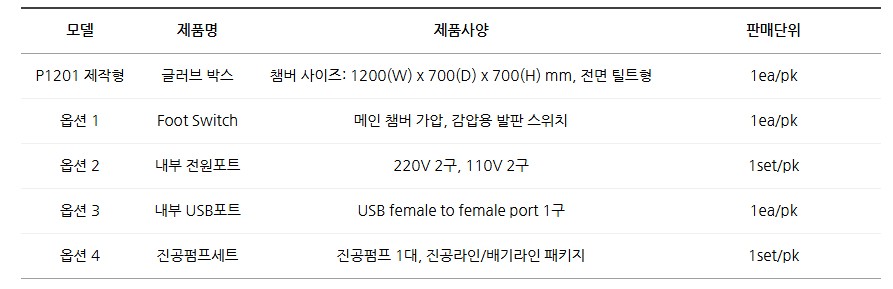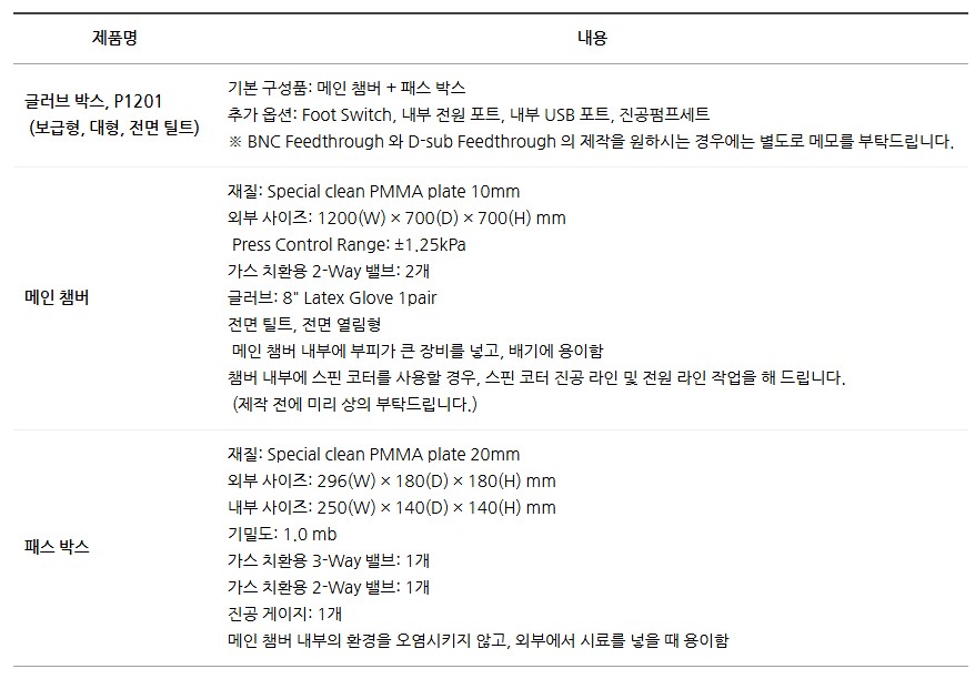품명 대형 글로브 박스 P1201, 연구실 실험용 투명 챔버. 다양한 옵션 선택 가능하며 시료 투입과 대형 장비 운용에 최적화된 연구 장비.