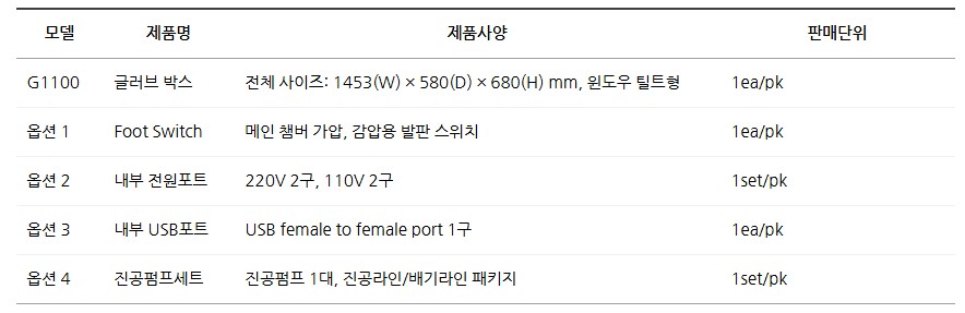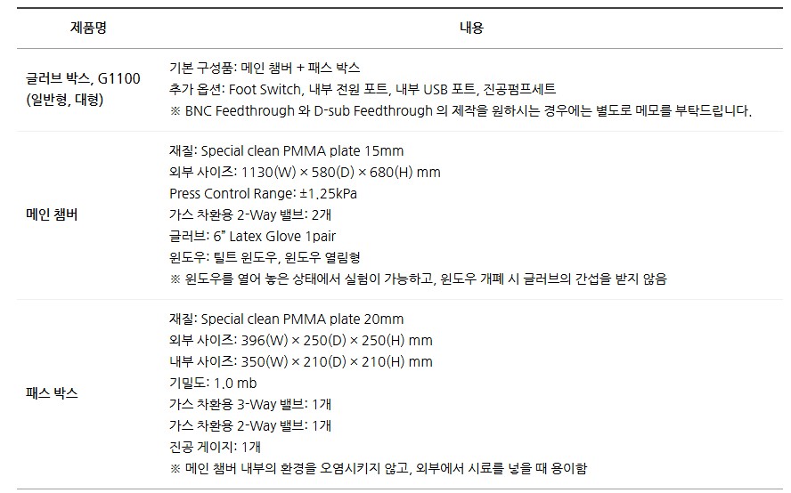 품명 G1100 글러브 박스. 메인 챔버와 패스 박스 구성, PMMA 재질로 제작된 대형 글러브 박스. 압력 제어, 가스 밸브, 진공 게이지 탑재, 다양한 옵션 제공.