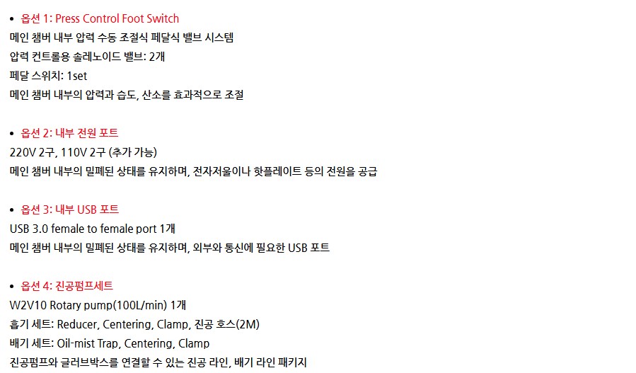 추가 옵션으로 Foot Switch, 내부 전원 포트, 내부 USB 포트, 진공펌프 세트를 제공하여 다양한 실험 환경에 맞게 확장할 수 있습니다.
