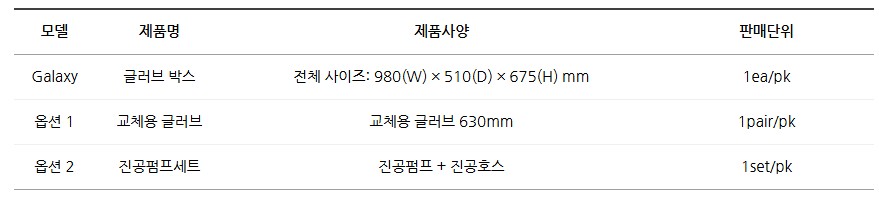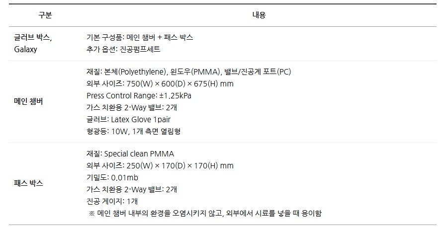품명 Galaxy 글러브 박스. 메인 챔버와 패스 박스 구성, PMMA 윈도우·Polyethylene 본체. 교체용 글러브 및 진공펌프세트 옵션 제공, 연구소와 클린룸 실험에 적합.