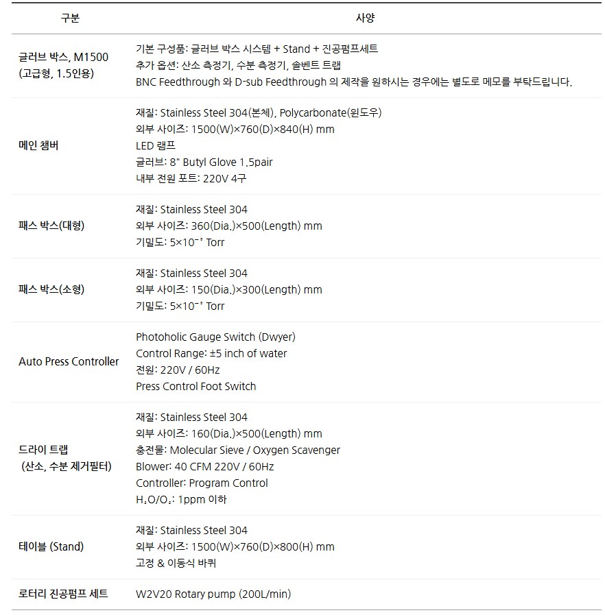 품명 M1500 글러브 박스 시스템, 진공펌프 세트 포함 고급형 1.5인용 모델. 산소·수분 측정기와 솔벤트 트랩 옵션 선택 가능, 연구소 및 산업 현장 최적 장비.
