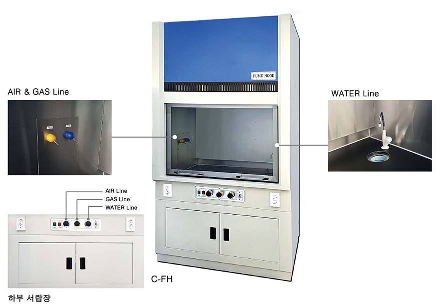 품명 유해가스 배출용 실험실 흄후드 C-FH 시리즈, AIR·GAS·WATER 라인 포함으로 안전한 실험공간 제공.