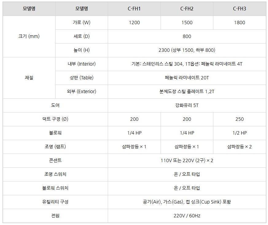 작업자의 호흡기 안전과 실내 공기 질을 확보해주는 C-FH 흄후드 시리즈입니다.