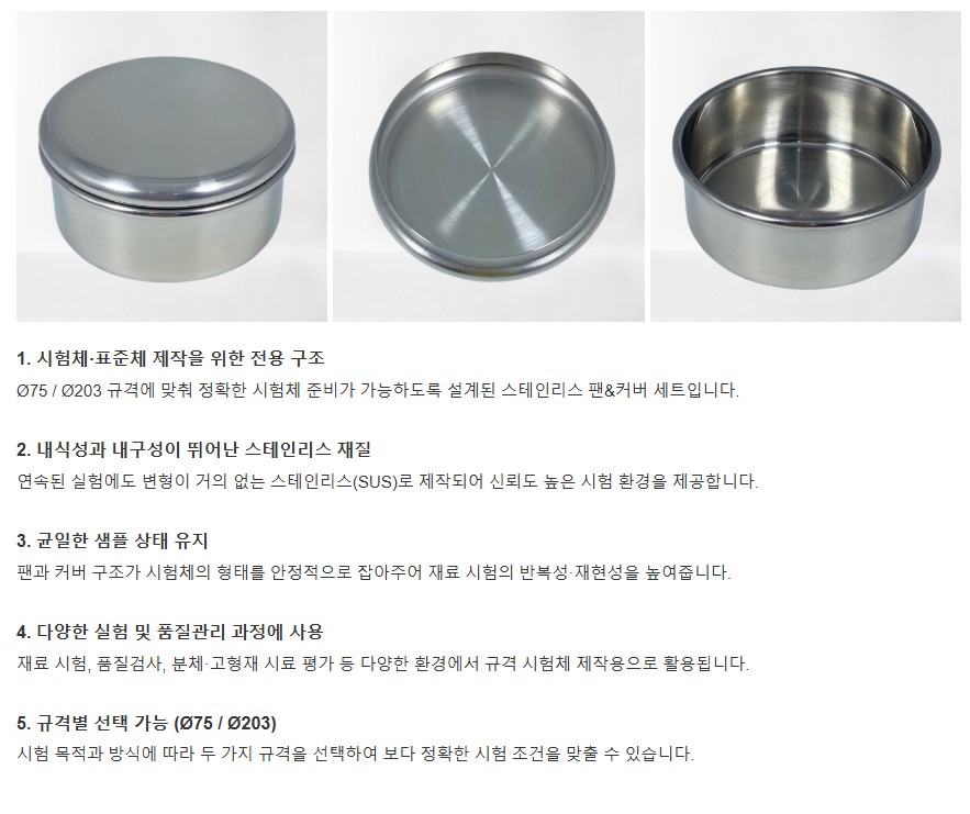 품명 Ø75·Ø203 규격의 VLS 스테인리스 시험체·표준체용 팬&커버 세트로 정밀한 시험체 제작에 적합합니다. 내구성과 재현성이 높아 품질시험 환경에 최적화된 구성입니다.