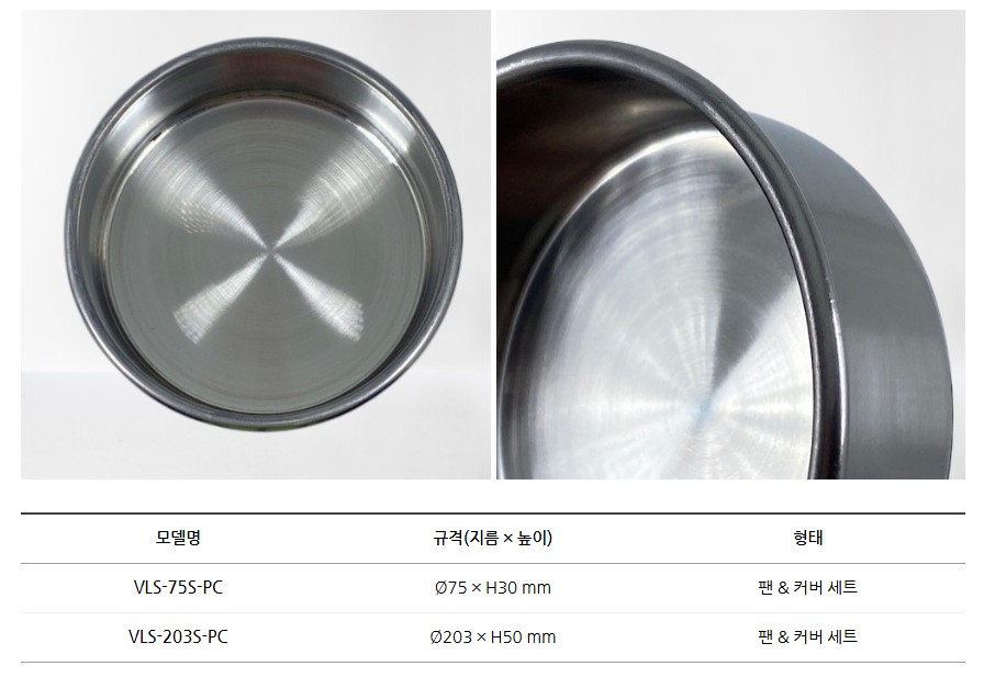 VLS-75S-PC와 VLS-203S-PC는 실험 및 분석 과정에서 사용하는 시험체·표준체용 스테인리스 팬&커버 세트입니다.