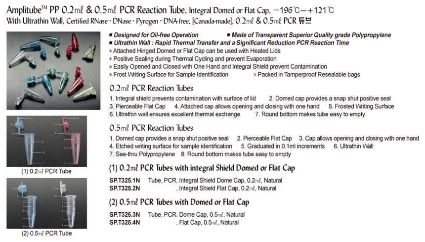 Amplitube TM PP 0.2㎖ & 0.5㎖ PCR Reaction Tube, Integral Domed or Flat Cap, -196℃~+121℃With Ultrathin Wall, Certified RNase·DNase·Pyrogen·DNA-free, [ Canada-made ] , 0.2 ㎖ & 0.5 ㎖ PCR튜브
