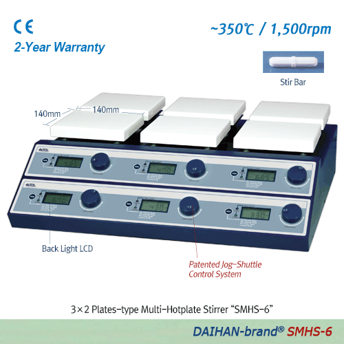 DAIHAN® 350℃ Systematic Multi-Hotplate Stirrer “SMHS” , 3- or 6-Places, Ceramic-Coated PlateWith Digital Feedback Control, Independent Heating & Stirring Control, up to 350℃, 80~1,500 rpm멀티 가열 자력 교반기, 우수한 온도균일성, 3- or 6- 구 개별 조절 가능