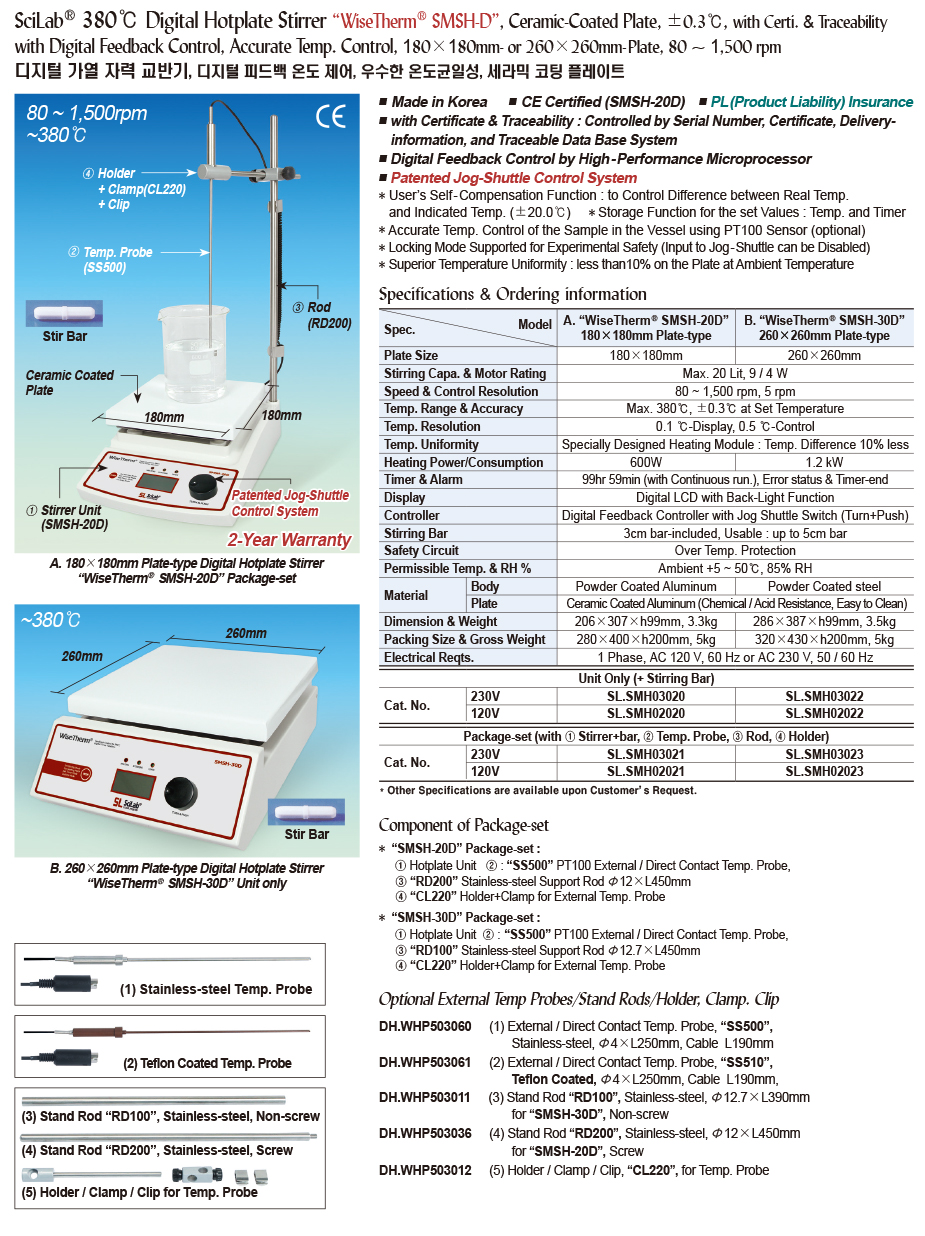 SciLab® 380℃ Digital Hotplate Stirrer “WiseTherm® SMSH-D”, Ceramic-Coated Plate, ±0.3℃, with Certi. & Traceability with Digital Feedback Control, Accurate Temp. Control, 180×180mm- or 260×260mm- Plate, 80 ~ 1,500 rpm 디지털 가열 자력 교반기, 디지털 피드백 온도 제어, 우수한 온도균일성, 세라믹 코팅 플레이트