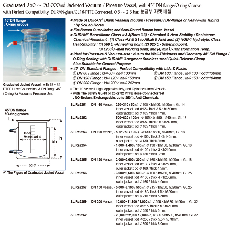 Graduated 250 ~ 20,000㎖ Jacketed Vacuum / Pressure Vessel, with 45°DN-flange/O-ring Groove with Perfect Compatibility, DURAN-glass/GL18-PTFE Connected, 0.5 ~ 2.5 bar