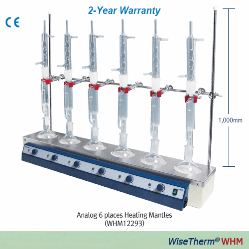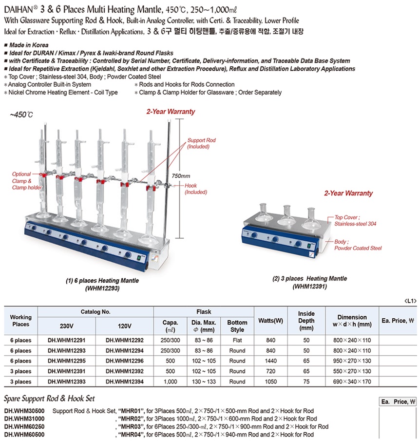 DAIHAN® Analog Aluminum-case Multi Heating Mantle, with 3 & 6 Places, 450℃, with Certi. & TraceabilityWith Glassware Supporting Rod & Clamp, Ideal for Extraction·Reflux·Distillation Applications, Lower Profile, 250~1,000㎖3 & 6 구 멀티 히팅맨틀, 추출/증류용에 적합, 조절기 내장