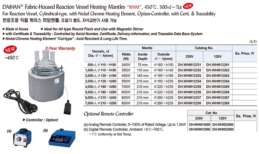 DAIHAN-brand® Fabric-Housed Reaction Vessel Heating Mantles, “WHM”, 0.5 ~ 7Lit, 450℃For Reaction Vessel, Cylindrical-type, with Nickel Chrome Heating Element, Option-Controller, with Certi. & Traceability반응조용 직물 케이스 히팅맨틀, 조절기 별도, 자석교반기 사용 가능