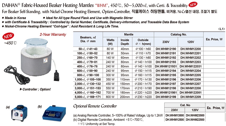 DAIHAN-brand® Fabric-Housed Heating Beaker Mantles, “WHM”, 50 ~ 5,000ml, 450℃, with Certi. & Traceability직물케이스 히팅맨틀, 비커용, For Beaker Self-Standing, with Nickel Chrome Heating Element, Option-Controller
