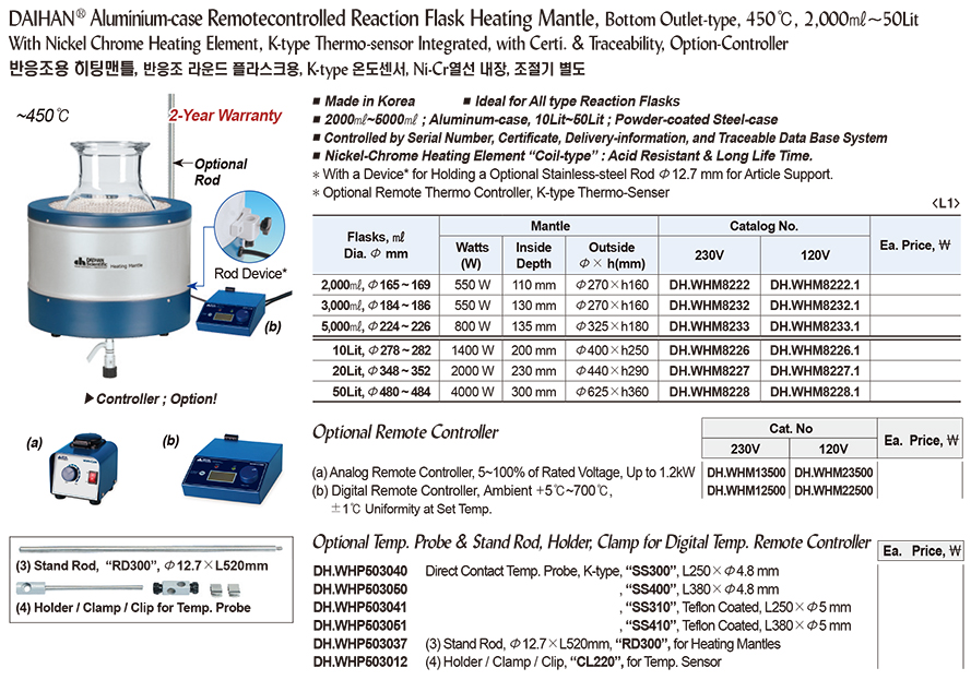 Remotecontrolled Reaction Flask Heating Mantle, Bottom Outlet-type, 450℃, 2,000㎖~50LitWith Nickel Chrome Heating Element, K-type Thermo-sensor Integrated, with Certi. & Traceability, Option-Controller