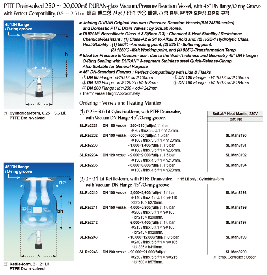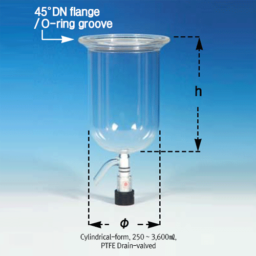 PTFE Drain-valved 250 ~ 20,000㎖ DURAN-glass Vacuum/Pressure Reaction Vessel, with 45°DN-flange/O-ring Groove with Perfect Compatibility, 0.5 ~ 2.5 bar, 배출 밸브형 진공 / 압력 반응 베셀, O-링 홈부, 완벽한 호환성 표준화 규격