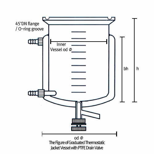 0.25 ~ 100 Lit Drain valved?Jacketed?Graduated Vacuum / Pressure Vessel, with 45°DN-flange/O-ring Groove with Perfect Compatibility, DURAN-glass, PTFE-valved/-GL connect, 0.5 ~ 2.5 bar