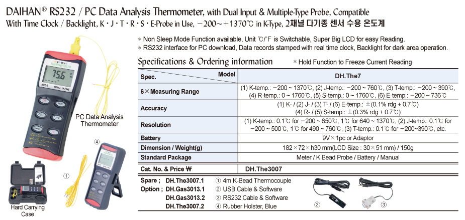 RS232 / PC Data Analysis Thermometer, with Dual Input & Multiple-Type Probe, CompatibleWith Time Clock / Backlight, K · J · T · R · S · E-Probe in Use, -200~+1370℃ in K-Type