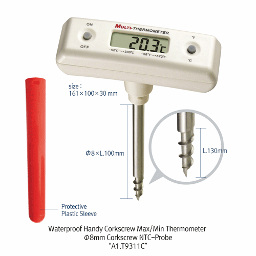 Waterproof/Handy Corkscrew Heavy-Duty Thermometer, for Frozen Food & Solid with Φ8mm Corkscrew NTC-Probe, Protective Sleeve, -50℃~+300℃, 0.1/1.0℃ Divi