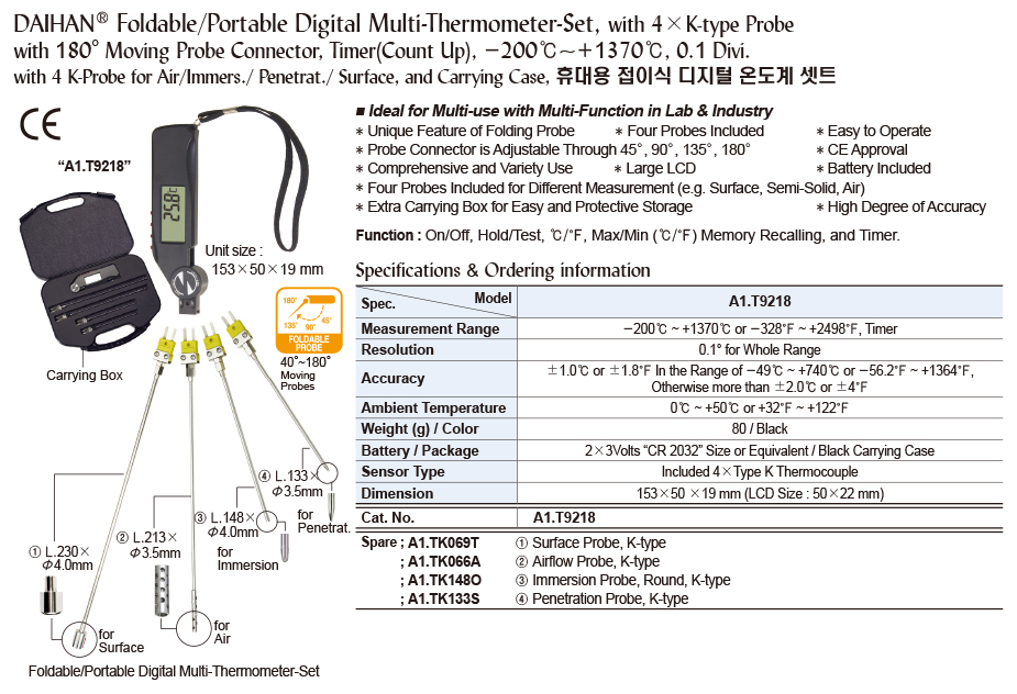 DAIHAN® 폴더블 휴대용 디지털 멀티 온도계 세트 "T9218", 180° 이동 프로브 커넥터, 타이머(카운트 업), -200°C+1370°C, 0.1 Divi, 에어-이머용 4K 프로브 포함.·페네트라트.