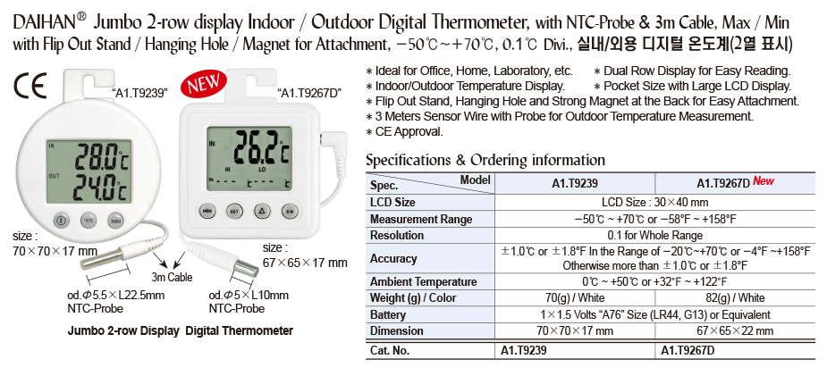 Jumbo 2-row display Indoor / Outdoor Digital Thermometer, with NTC-Probe & 3m Cable, Max / Min with Flip Out Stand / Hanging Hole / Magnet for Attachment, -50℃~+70℃, 0.1℃ Divi