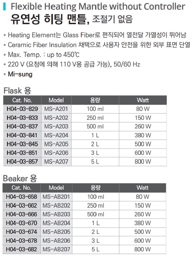 Flask 용| Cat. No | Model | 용량 | Watt |