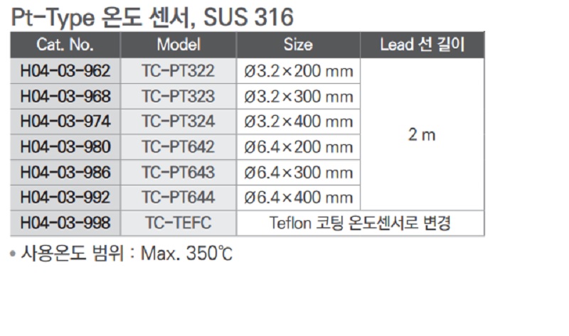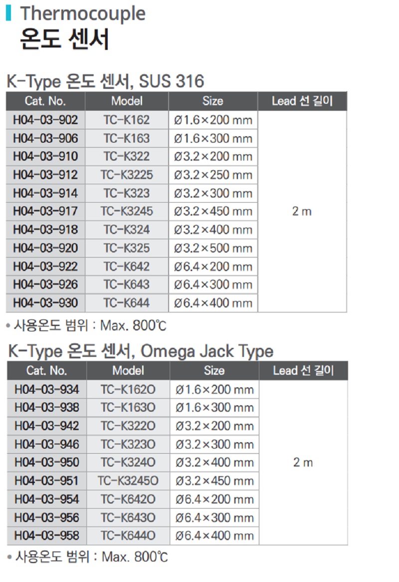 ● 사용온도 범위 : Max. 800℃ | Cat. No | Model | Size | Lead 선 길이 |