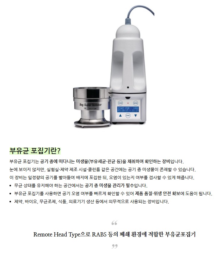 부유균 포집기 멸균구역 미생물 포집 모니터링 시스템 SAS Super Isolator 100/180