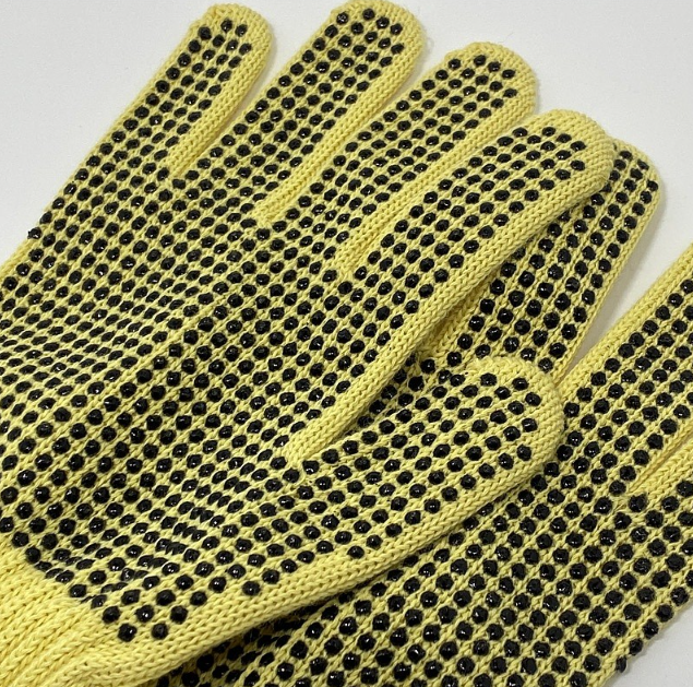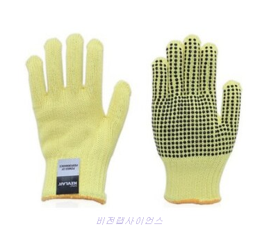 품명 ■ 내열성 듀폰 케블라(Dupont Kevlar) 섬유(분해온도: 427℃~482℃) 편직 장갑 ■ 손바닥 PVC 단면도트 코팅으로 미끌림 방지