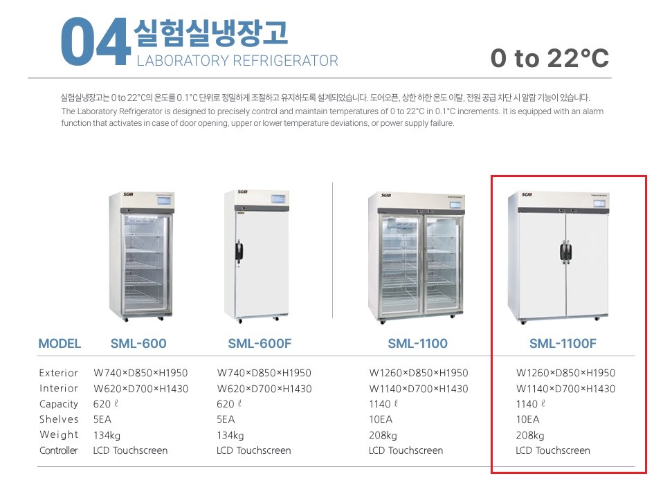 품명 SML-1100F 실험실 냉장고, 0~22℃ 정밀 제어, 1140L 대용량, 7인치 LCD 터치스크린과 데이터 관리 기능으로 안정적 시약 보관 제공.