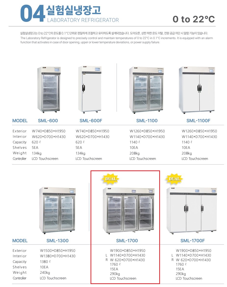 SML-1700 모델은 실험실에서 시약 및 샘플을 안전하게 보관할 수 있도록 설계된 대형 실험실 냉장고입니다.