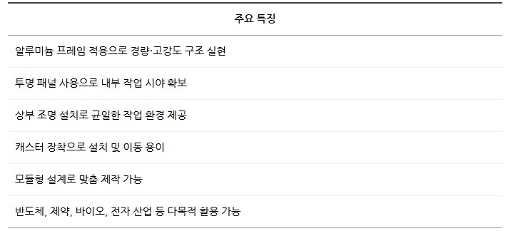 품명 알루미늄 프레임과 투명 패널로 제작된 클린부스, 내부 시야 확보와 이동식 구조로 반도체·제약·바이오 현장에 최적화된 청정 공간.