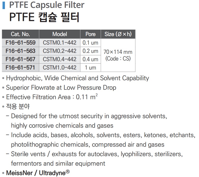 공통 Specification* Housing Material : PP* Filtration Media : PVDF, PP, PTFE, PES* Media Support Component : PP* Sealing Method : Thermal Bonding* Maximum Operating Pressure* Liquid : 5.2 bar at 38℃* Gas : 3.4 bar at 38℃* Operating Temperature Range : 0℃~38℃* Max. Temperature : 71℃ at 2.4 bar* Vent Port- Two Luer-Lock Port for Venting, Draining, Sampling* Inlet Outlet : 1/4" MNPT Standard* Optional- 1" Sanitary Flange (Code : 00)- 3/8" Horsbarb (Code : 22)- 1/2" Horsbarb (Code : cc)- 3/8" FNPT (Code : 55)- 3/8" MNPT (Code : 66)* Size : Φ70×h114 mm (Standard, Code : CS)* Optional- Φ70×h175 mm (Code : CL)- Φ57×h83 mm (Code : CF)- Φ32×h140 mm (Code : CM)- Φ32×h159 mm (Code : CK)* Sterilization : Autoclave at 121℃ (60 min), 125℃ (45 min)* 제조 환경 : Cleanroom, 100% Integrity Tested During Manufacture.