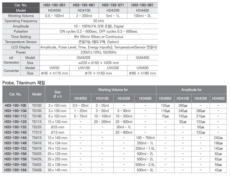 | Cat. No | Model | 규격 | Horn | Probe |