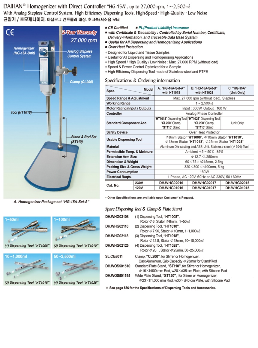 DAIHAN® Homogenizer with Direct Controller “HG-15A” , up to 27,000 rpm, 1 ~2,500 ㎖With Analog Stepless Control System, High Efficiency Dispersing Tools, High-Speed · High-Quality · Low Noise균질기 / 호모게나이저, 아날로그 컨트롤러 내장, 초고속/저소음 모터