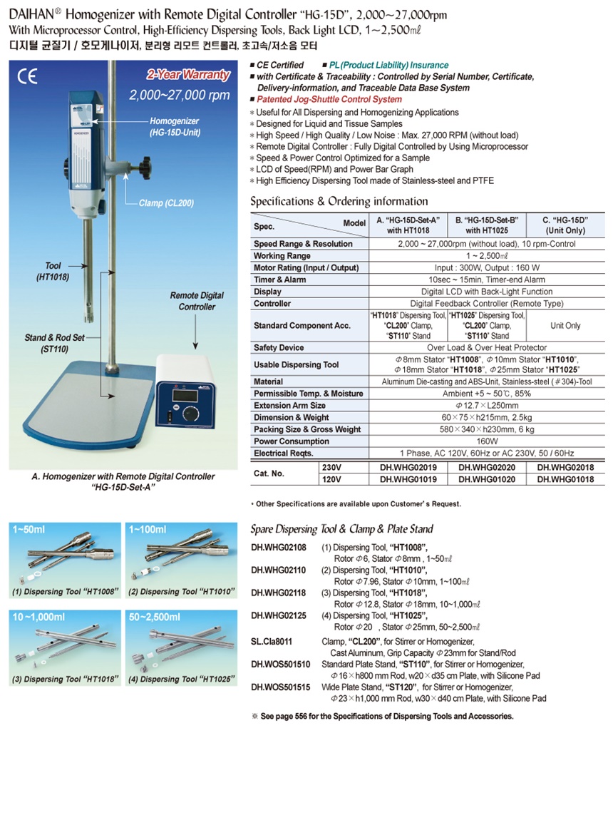 DAIHAN® Homogenizer with Remote Digital Controller “HG-15D” , 2,000~27,000rpmWith Microprocessor Control, High-Efficiency Dispersing Tools, Back Light LCD, 1 ~2,500 ㎖디지털 균질기 / 호모게나이저, 분리형 리모트 컨트롤러, 초고속/저소음 모터
