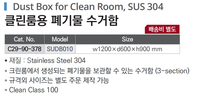 품명 ■ 재질 : Stainless Steel 304 ■ 크린룸에서 생성되는 폐기물을 보관할 수 있는 수거함 (3-section) ■ 규격외 사이즈는 별도 주문 제작 가능함 ■ Clean Class 100