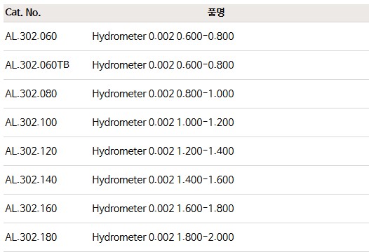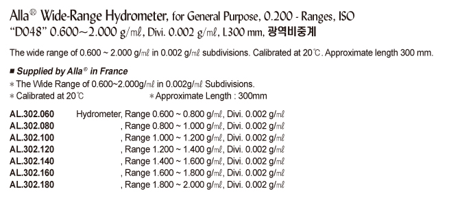 0.002g/ml 단위로 0.600~2.000g/ml의 넓은 범위. 20°C에서 보정. 길이는 약 300mm입니다.