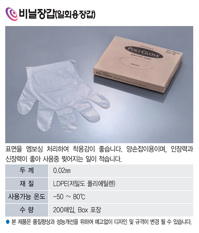 품명 코드번호 : VLS-4239 품명 : 비닐장갑 개요 : 표면을 엠보싱 처리하여 착용감이 좋습니다. 양손잡이용이며, 인장력과 신장력이 좋아 사용중 찢어지는 일이 적습니다.