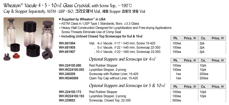 Wheaton® Vacule 4·5·10 ㎖ Glass Cryovial, with Screw Top, -190℃Cap & Stopper Separately, ASTM · USP · ISO