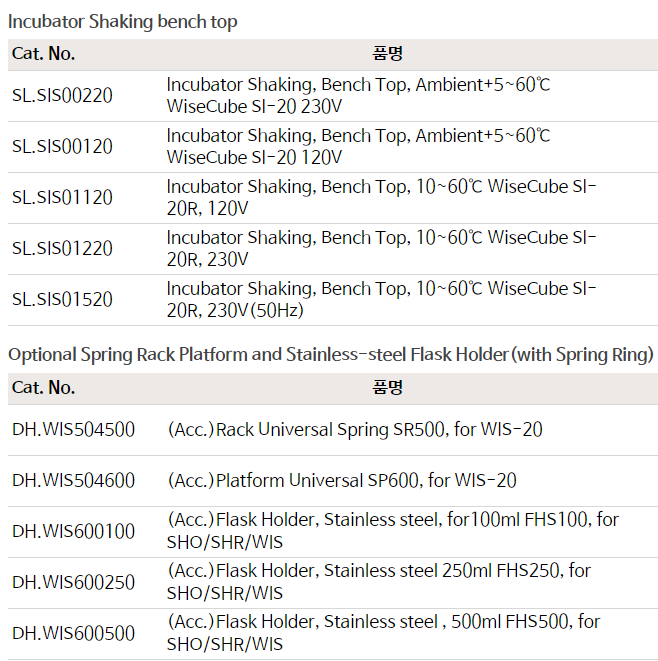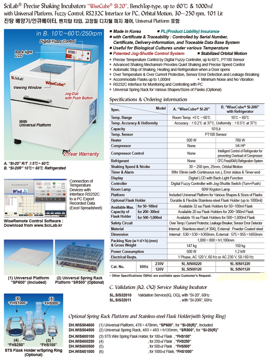 SciLab® Precise Shaking Incubators “WiseCube® SI-20”, BenchTop-type, up to 60℃ & 1000㎖ with Universal Platform, Fuzzy Control, RS232C Interface for PC, Orbital Motion, 30~250 rpm, 101 Lit 진탕 배양기/인큐베이터, 벤치탑 타입, 고정밀 디지털 퍼지 제어, Universal Platform 포함